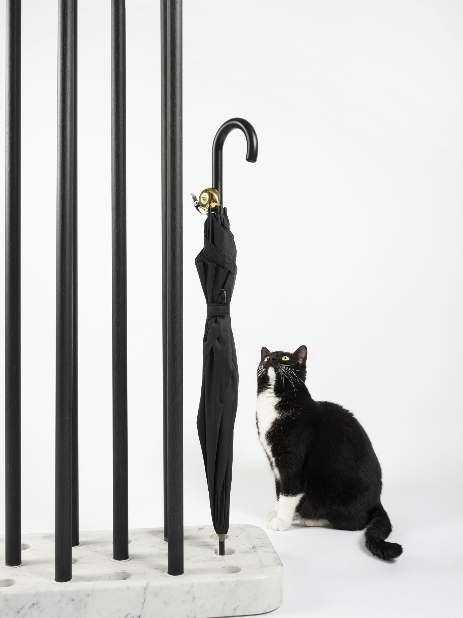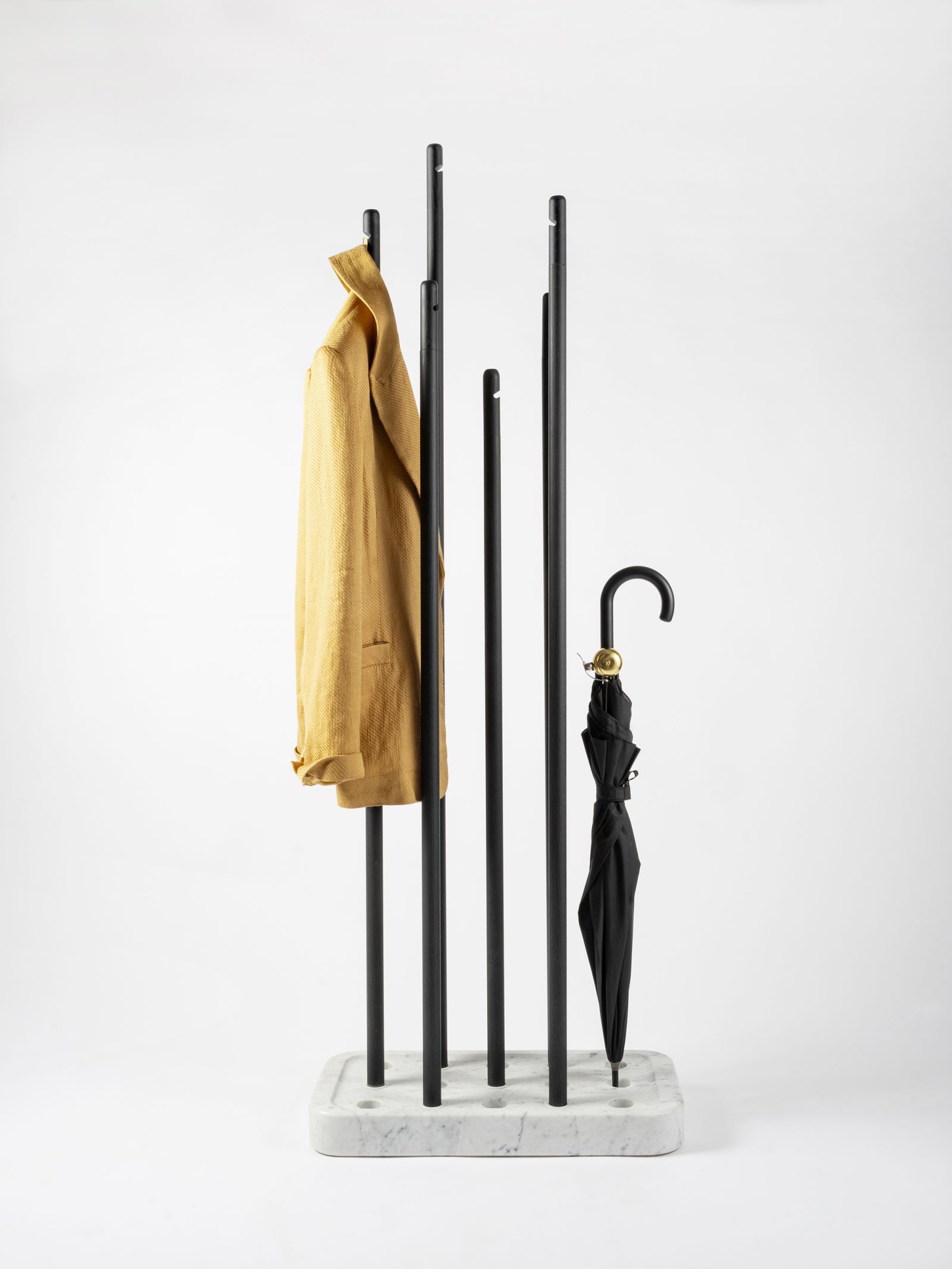 Laurel is a coats hanger and an umbrellas support made of wooden sticks plugged into a Carrare marble base.